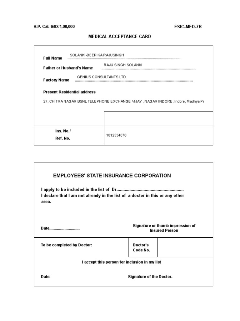 Esic Form 7b Filled Sample Medical Acceptance Card Download