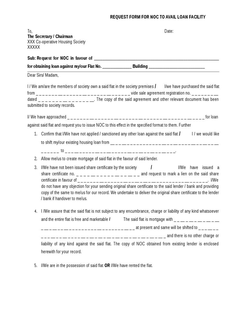 Request For Noc To Avail Loan Loans Mortgage Loan